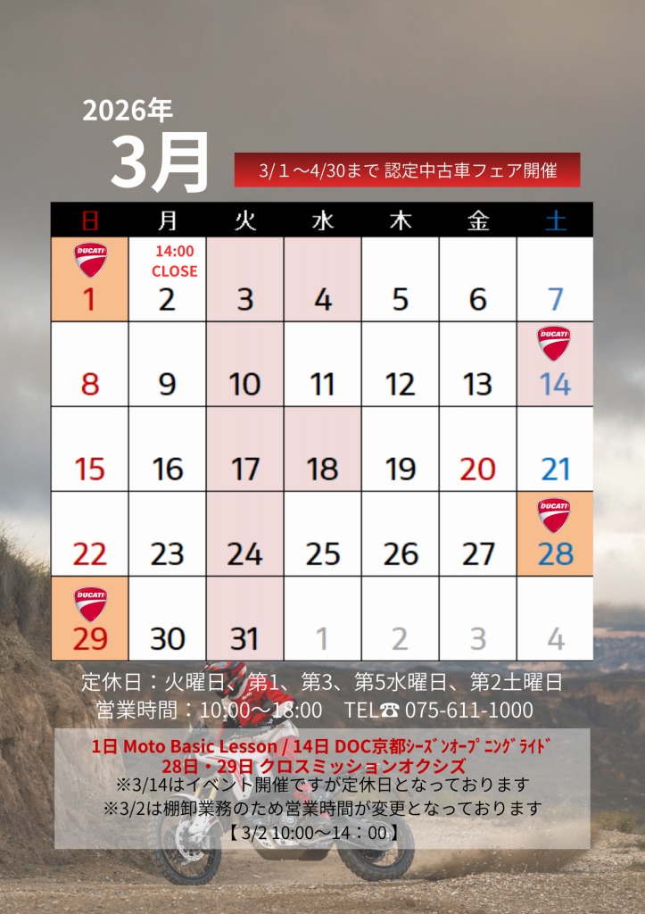 ■3/1~4/30まで ドゥカティ京都認定中古車フェア開催!